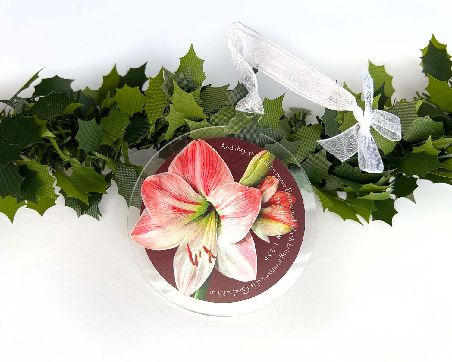 3" round acrylic Christmas tree ornament featuring Matthew 1:23b and original red and white amaryllis artwork.
