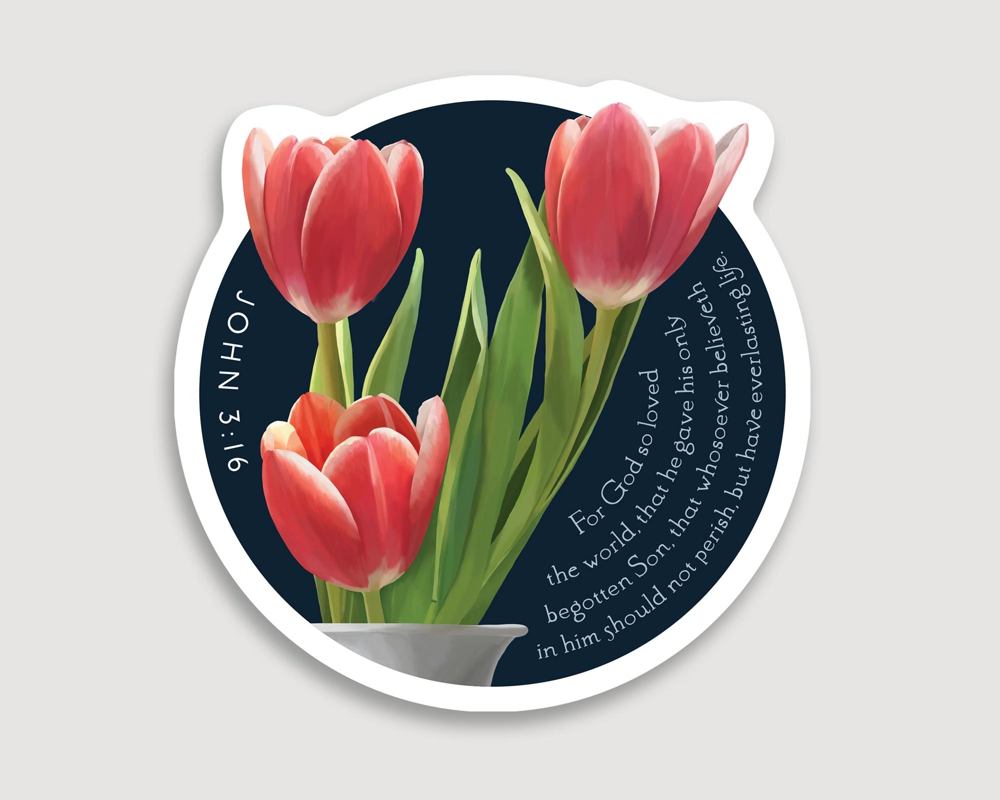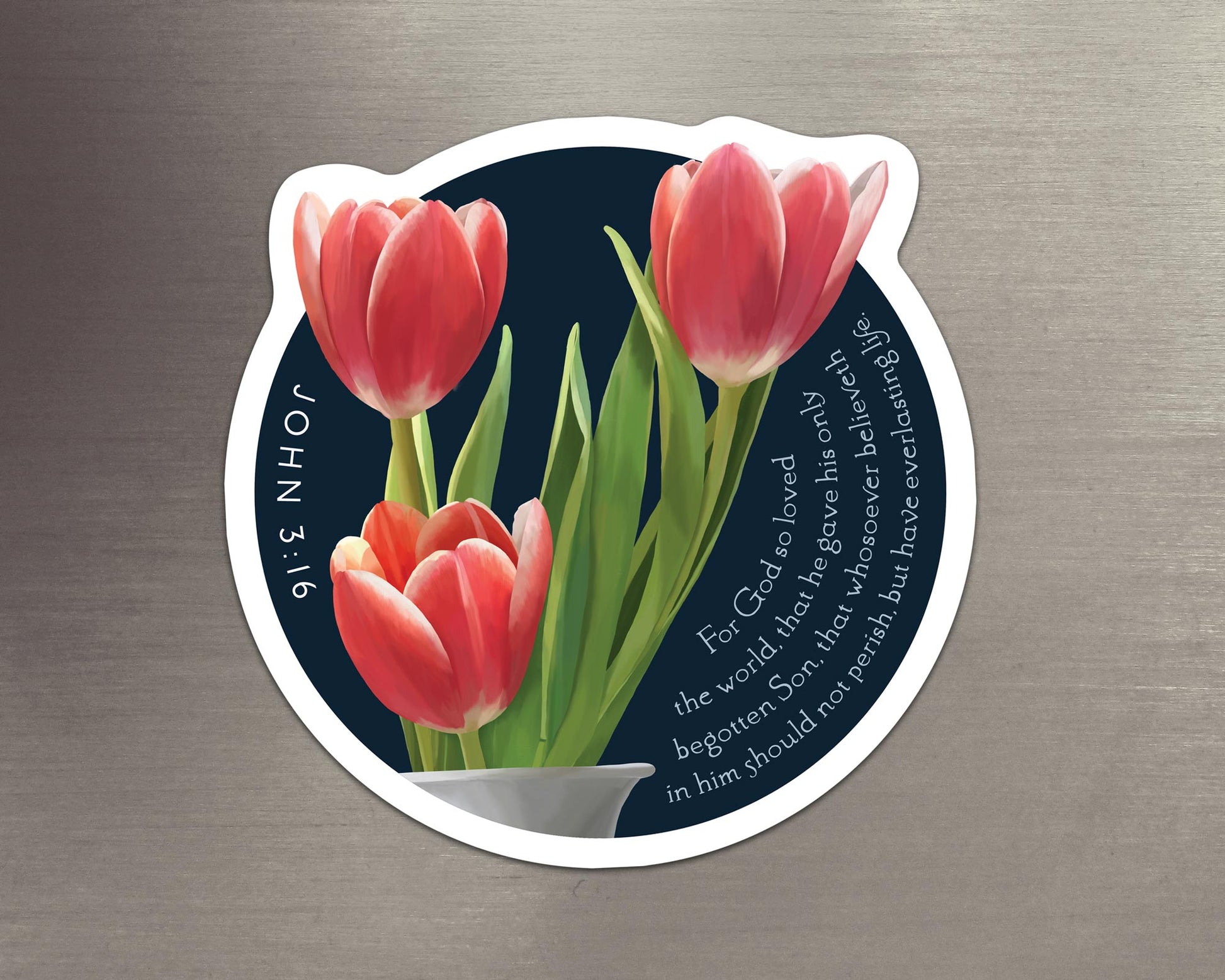 God loves you SO MUCH! Display this magnet where you'll see it and remember that God sent His Son, Jesus, to die so that you may live with Him forever. Original artwork of pink and white tulips features John 3:16.